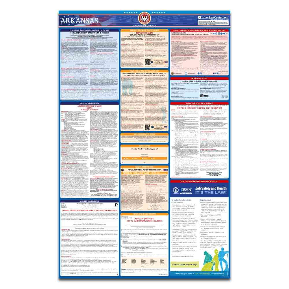Place one order for the Arkansas Compliance Protection Plan and all of the state and federal workplace postings legally required will be yours through the Arkansas State and Federal Complete Labor Law Poster which is included in the Protection Plan. This is an all-in-one poster that satisfies all of your employment workplace posting requirements. In addition, it’s important to note that if you fail to display the current labor law posters at your firm, you may face disputes and lawsuits from your employees due to non-compliance in this area.