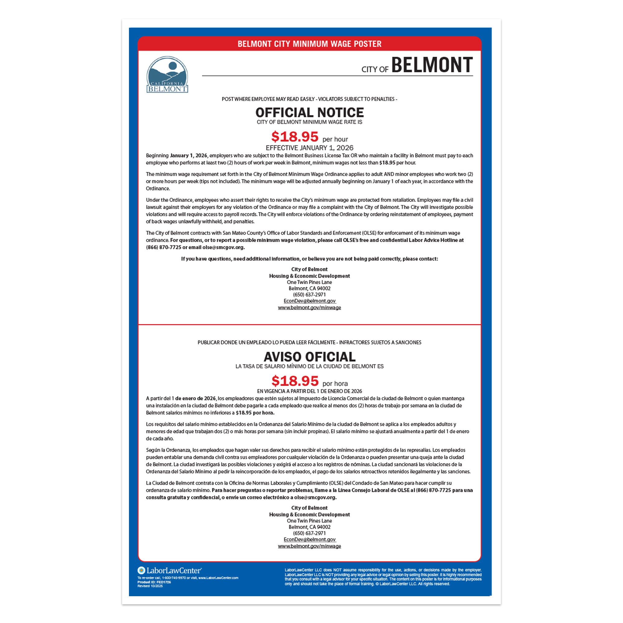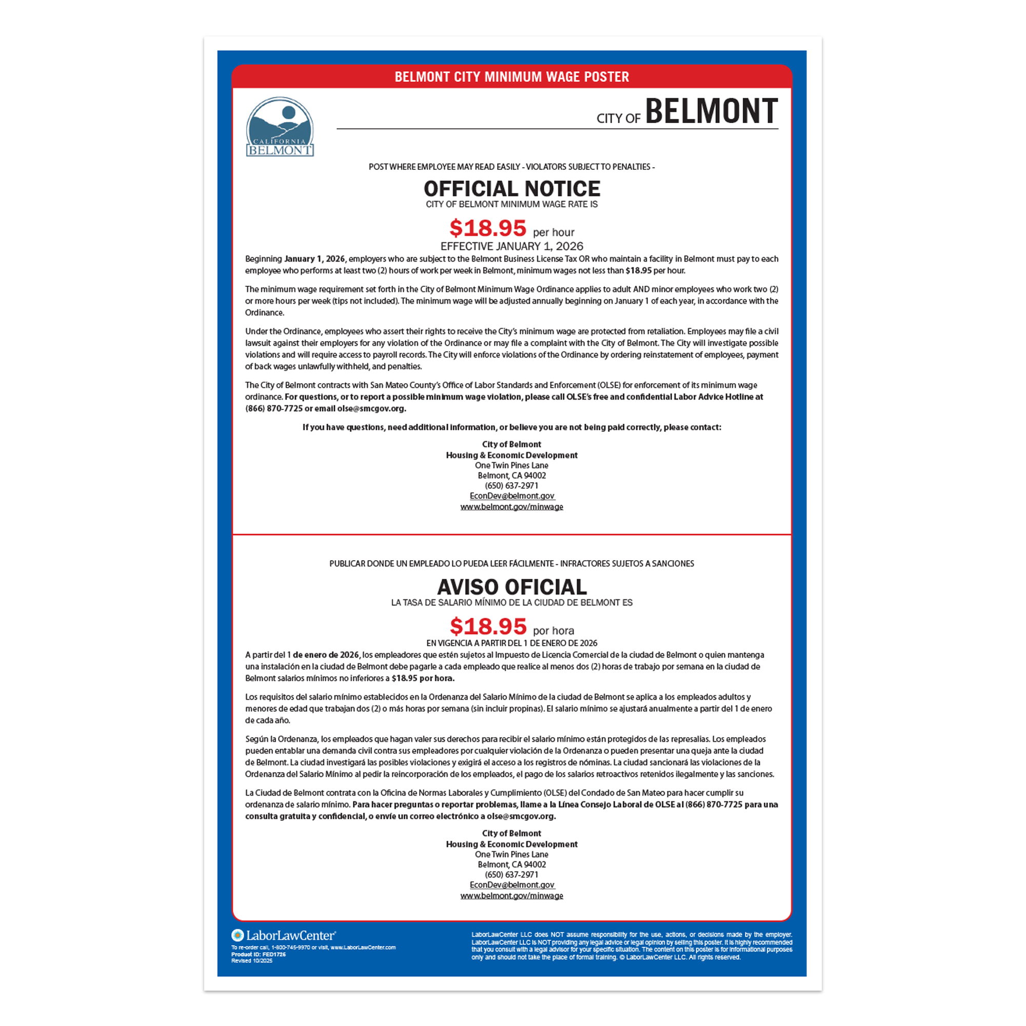 All businesses with employees in Belmont, CA are legally required to post this city mandated poster in addition to California State & Federal Labor Law Posters. This poster meets requirements & protects businesses from posting fines & employee disputes.