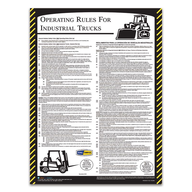The California Forklift Poster meets California's Forklift safety standards. Please refer to the Mandatory Federal Forklift Poster for businesses that operate a forklift outside of California.