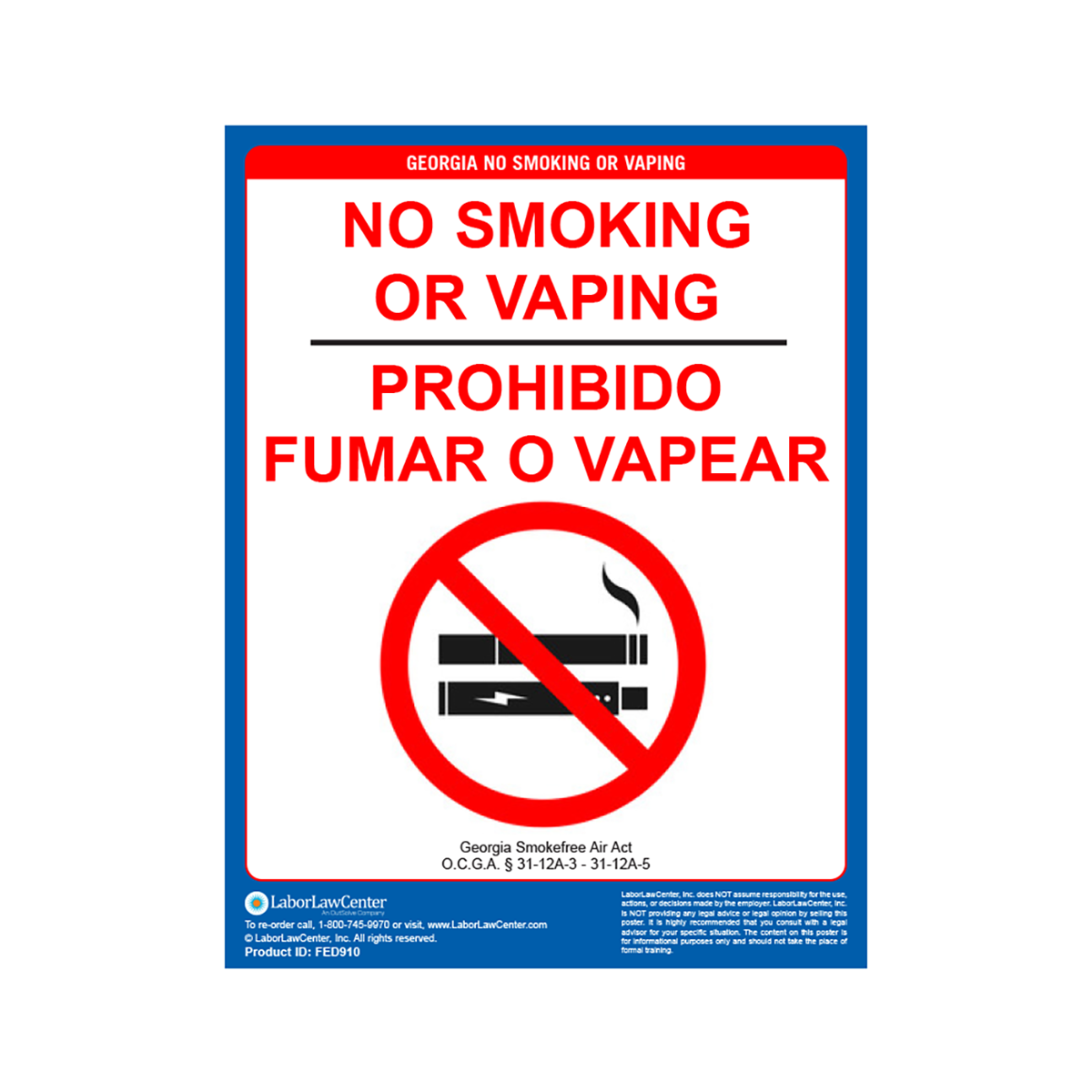 Employers can help to ensure that employees comply with the Georgia Smokefree Air Act of 2005 by posting no smoking signs throughout the workplace in an area that is visible to all employees, such as an employee break room. These posters are available in both Spanish and English.