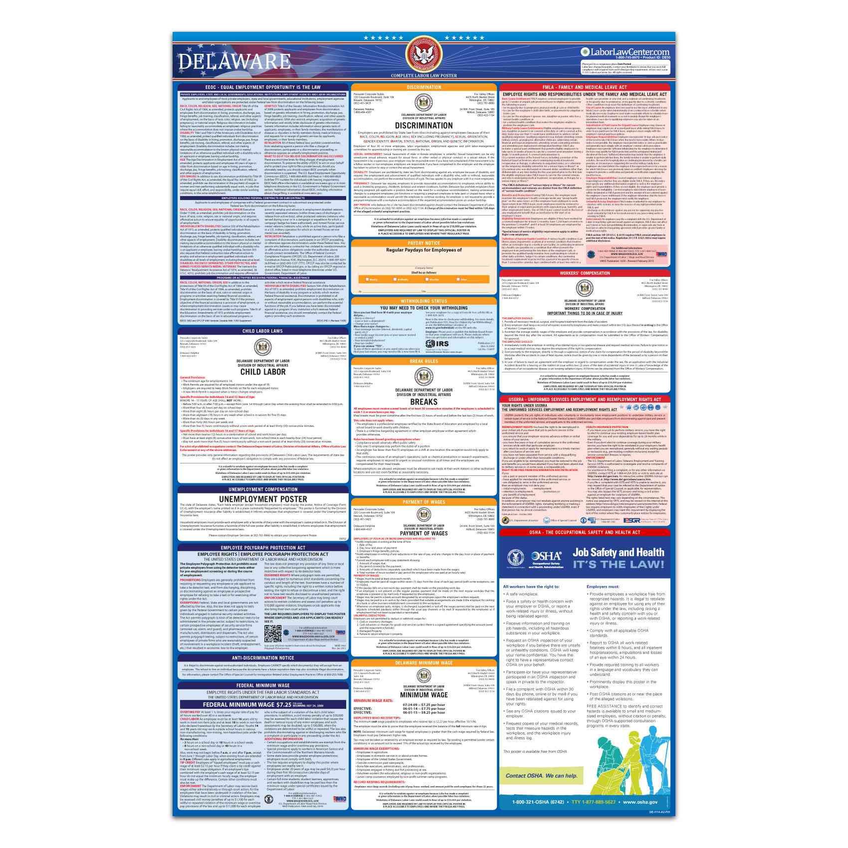 If you want to be in legal compliance as far as which labor law posters need to be displayed at your business, your solution is the the Delaware State and Federal Complete Poster by LaborLawCenter™. Instead of purchasing multiple posters all you need to do is place this all-in-one state and federal labor law poster in a conspicuous location in order to satisfy your employment workplace posting requirement.