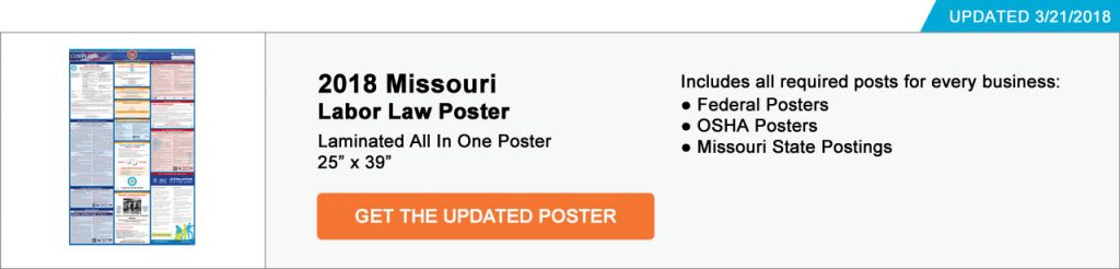All Missouri businesses are required by state law to update labor law posters to reflect this change. Order the All-In-One Missouri Labor Law Poster with this latest update to stay in compliant state labor laws. Labor Law Center continually monitors local, state and federal posting requirements and has been helping thousands of businesses maintain compliance since 1999.