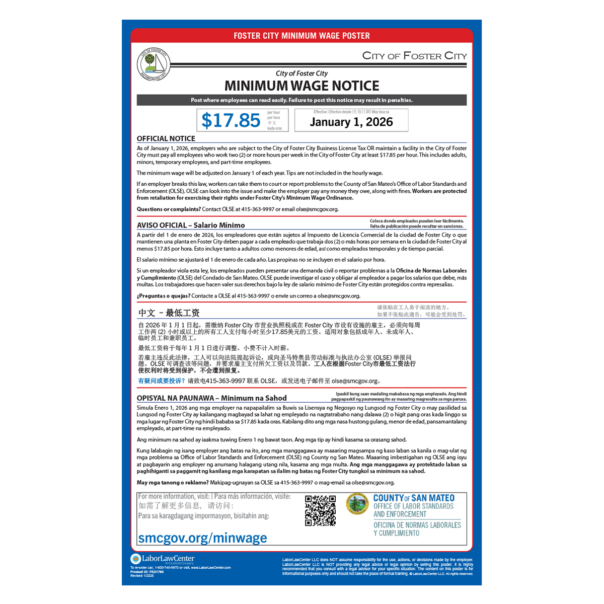 All businesses with employees in Foster City, CA are legally required to post this city-mandated minimum wage labor law poster in addition to California State & Federal Labor Law Posters.
