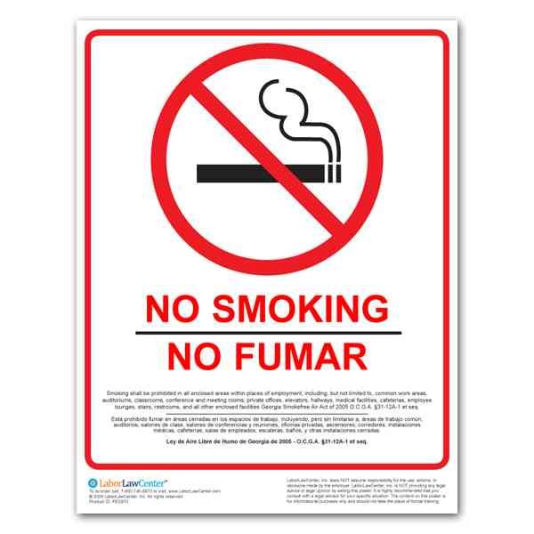 Employers can help to ensure that employees comply with the Georgia Smokefree Air Act of 2005 by posting no smoking signs throughout the workplace in an area that is visible to all employees, such as an employee break room. These posters are available in both Spanish and English.