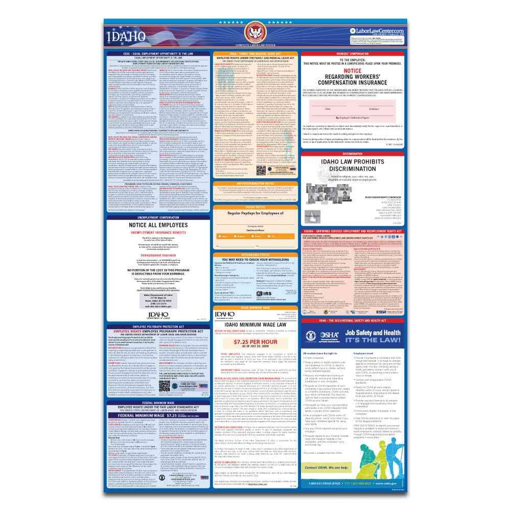 Place one order for the Idaho & Federal Labor Law Poster + 2024 Replacement Service and all of the state and federal workplace postings legally required will be yours through the Idaho State and Federal Complete Labor Law Poster. This is a complete poster that satisfies all of your employment workplace posting requirements. In addition, it’s important to note that if you fail to display the current labor law posters at your firm, you may face disputes and lawsuits from your employees due to non-compliance in this area.