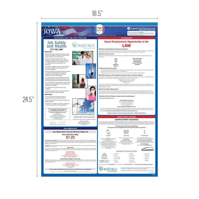 Looking for a single poster that includes all mandatory regulations? Consider our Iowa Complete Labor Law Poster. This oversized poster includes all state, federal, and OSHA requirements on single poster for $29.95. This poster is typically attractive to businesses that just want everything on one poster, rather than purchasing multiple posters to meet compliance requirements.