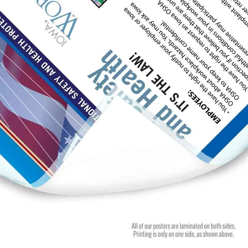 Both the Iowa and US government mandate that both state and federal posters must be posted. For your convenience and preference, we currently offer both formats to assist you with your compliance needs. Posters are typically purchased separately (state and federal) due to a business’ preference, or if size doesn't permit, a single State Only poster that may be larger. We are the industry’s leading company that can provide you with either option including: the Iowa State Only Labor Law Poster, which includes all mandatory state requirements on a single poster for $21.95, and the mandatory Federal Poster for $12.95, which you can add to your order in the purchasing options above. Simple choose the format that is right for your workplace.