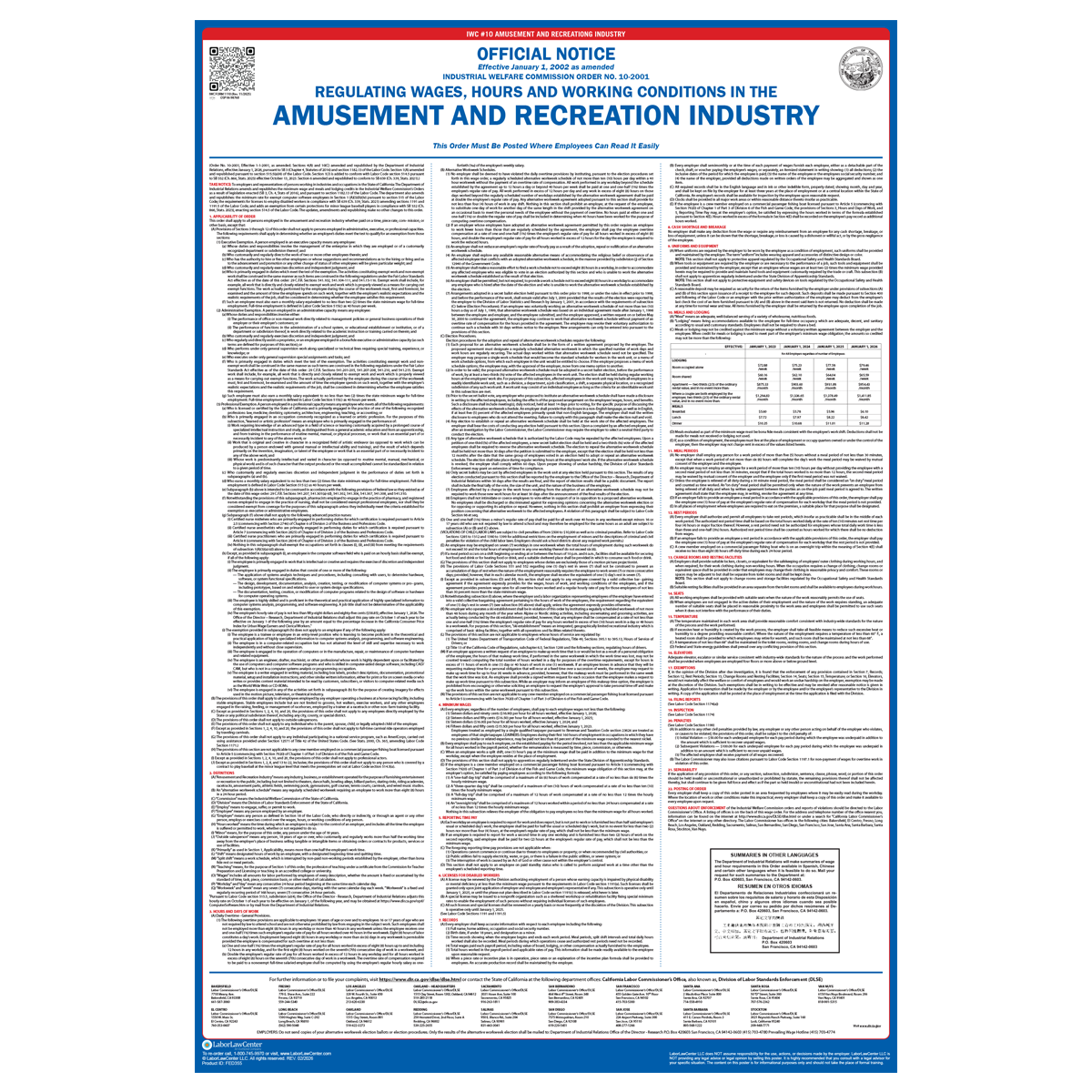The Industrial Welfare Commission is a California State Agency whose primary purpose is to ascertain the wages paid to all employees in the state of California, to ascertain the hours and conditions of labor and employment in the various occupations, trades and industries in which employees are employed in this state, and to investigate the health, safety and welfare of those employees. The Industrial Welfare Commission has mandated that specific wage orders be posted, in the workplace, to inform employees of their wage and hour rights. These wage orders are known as IWC Postings or IWC Wage Orders. It is broken into 17 different categories. The poster is a mandatory poster that must be posted next to the State and Federal labor laws.