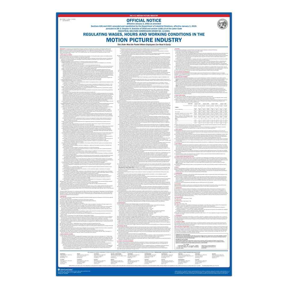 The Industrial Welfare Commission is a California State Agency whose primary purpose is to ascertain the wages paid to all employees in the state of California, to ascertain the hours and conditions of labor and employment in the various occupations, trades and industries in which employees are employed in this state, and to investigate the health, safety and welfare of those employees. The Industrial Welfare Commission has mandated that specific wage orders be posted, in the workplace, to inform employees of their wage and hour rights. These wage orders are known as IWC Postings or IWC Wage Orders. It is broken into 17 different categories. The poster is a mandatory poster that must be posted next to the State and Federal labor laws.