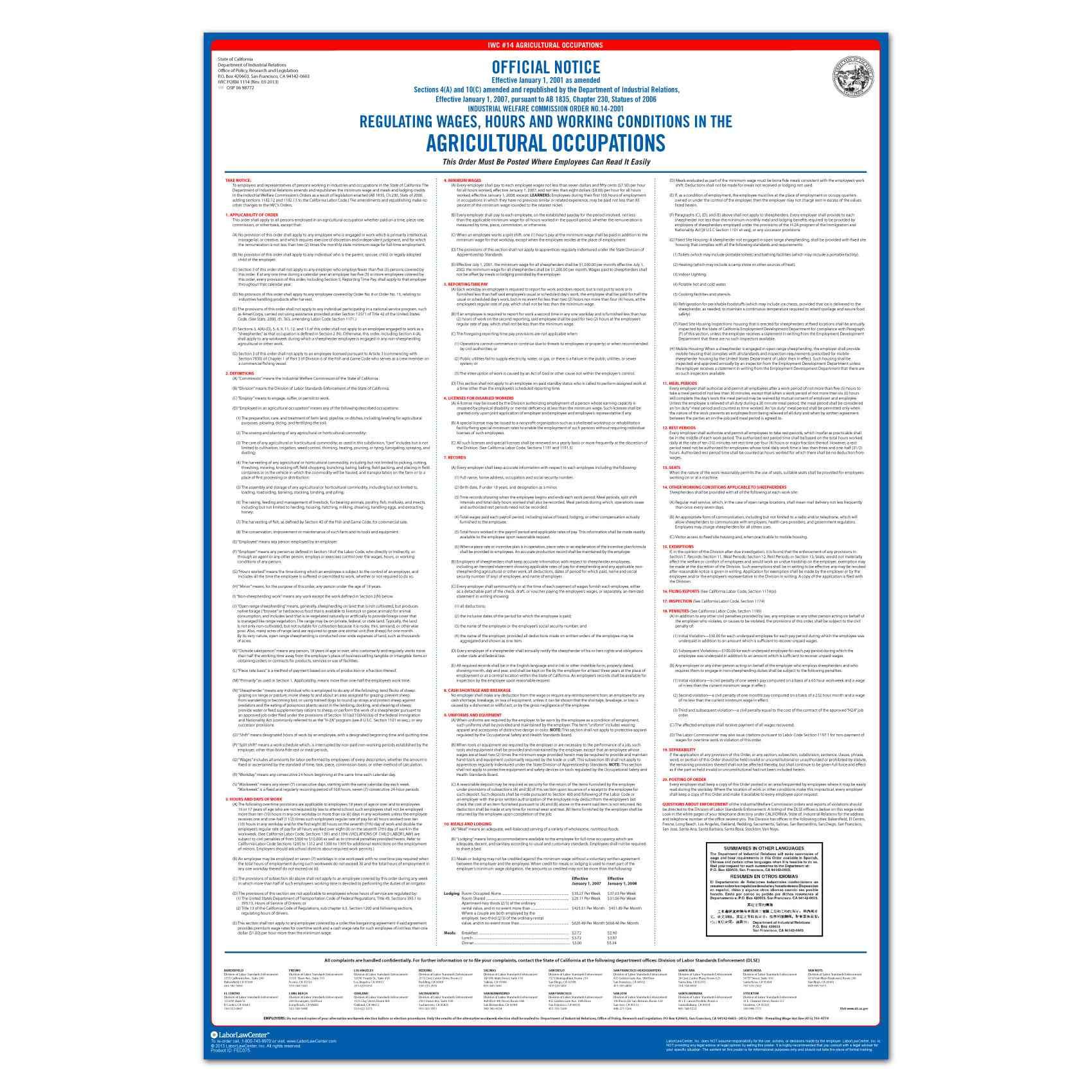 The Industrial Welfare Commission is a California State Agency whose primary purpose is to ascertain the wages paid to all employees in the state of California, to ascertain the hours and conditions of labor and employment in the various occupations, trades and industries in which employees are employed in this state, and to investigate the health, safety and welfare of those employees. The Industrial Welfare Commission has mandated that specific wage orders be posted, in the workplace, to inform employees of their wage and hour rights. These wage orders are known as IWC Postings or IWC Wage Orders. It is broken into 17 different categories. The poster is a mandatory poster that must be posted next to the State and Federal labor laws.