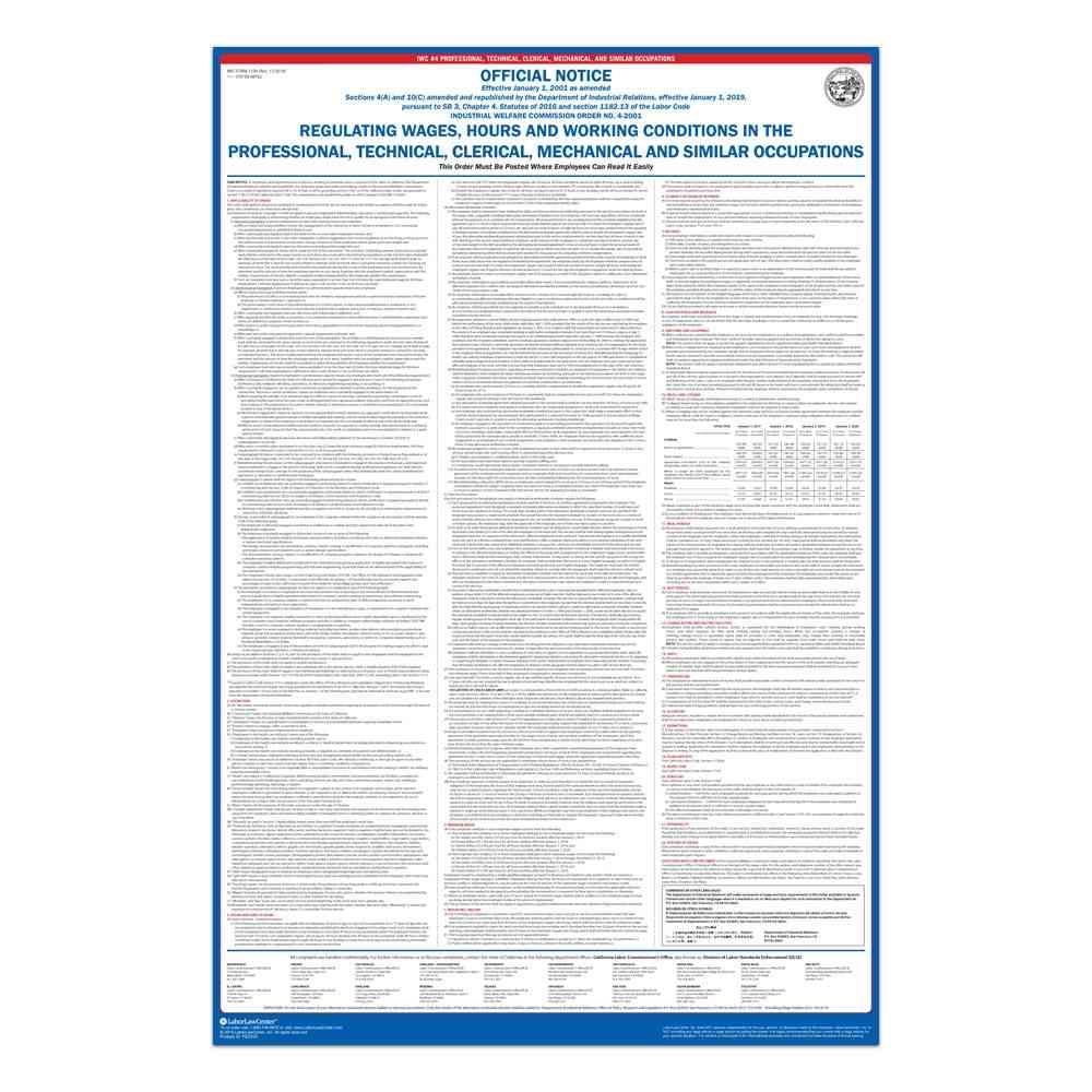 The Industrial Welfare Commission is a California State Agency whose primary purpose is to ascertain the wages paid to all employees in the state of California, to ascertain the hours and conditions of labor and employment in the various occupations, trades and industries in which employees are employed in this state, and to investigate the health, safety and welfare of those employees. The Industrial Welfare Commission has mandated that specific wage orders be posted, in the workplace, to inform employees of their wage and hour rights. These wage orders are known as IWC Postings or IWC Wage Orders. It is broken into 17 different categories. The poster is a mandatory poster that must be posted next to the State and Federal labor laws.