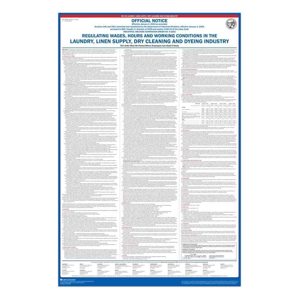 The Industrial Welfare Commission is a California State Agency whose primary purpose is to ascertain the wages paid to all employees in the state of California, to ascertain the hours and conditions of labor and employment in the various occupations, trades and industries in which employees are employed in this state, and to investigate the health, safety and welfare of those employees. The Industrial Welfare Commission has mandated that specific wage orders be posted, in the workplace, to inform employees of their wage and hour rights. These wage orders are known as IWC Postings or IWC Wage Orders. It is broken into 17 different categories. The poster is a mandatory poster that must be posted next to the State and Federal labor laws.