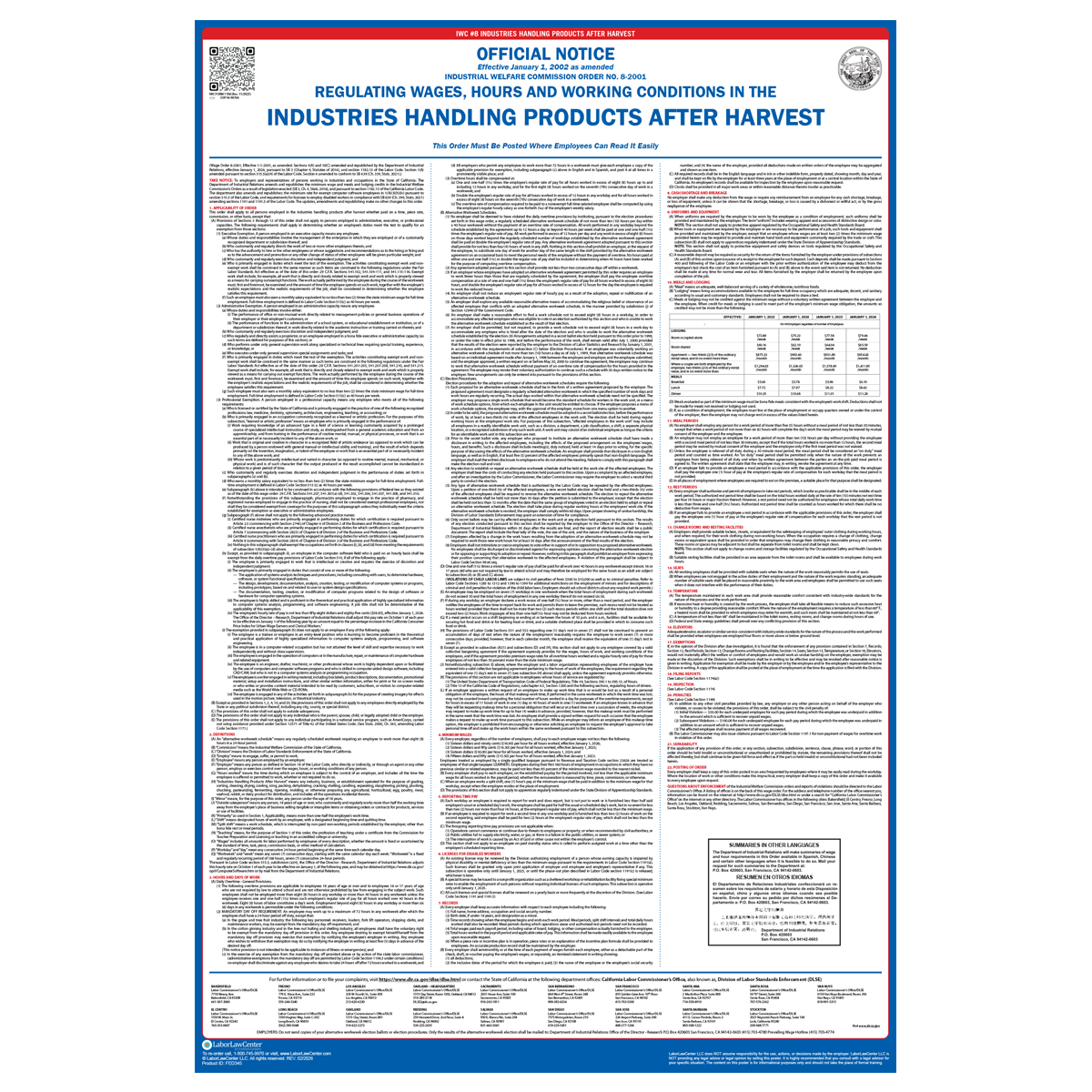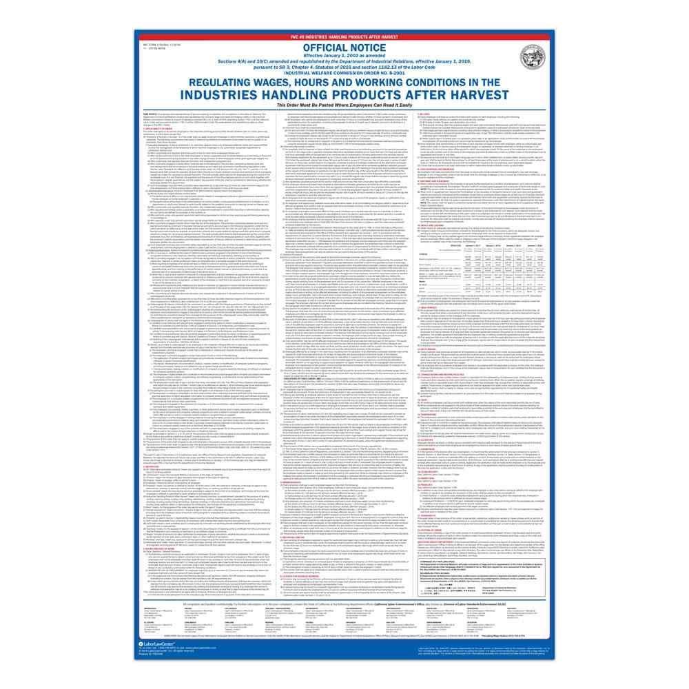 The Industrial Welfare Commission is a California State Agency whose primary purpose is to ascertain the wages paid to all employees in the state of California, to ascertain the hours and conditions of labor and employment in the various occupations, trades and industries in which employees are employed in this state, and to investigate the health, safety and welfare of those employees. The Industrial Welfare Commission has mandated that specific wage orders be posted, in the workplace, to inform employees of their wage and hour rights. These wage orders are known as IWC Postings or IWC Wage Orders. It is broken into 17 different categories. The poster is a mandatory poster that must be posted next to the State and Federal labor laws.