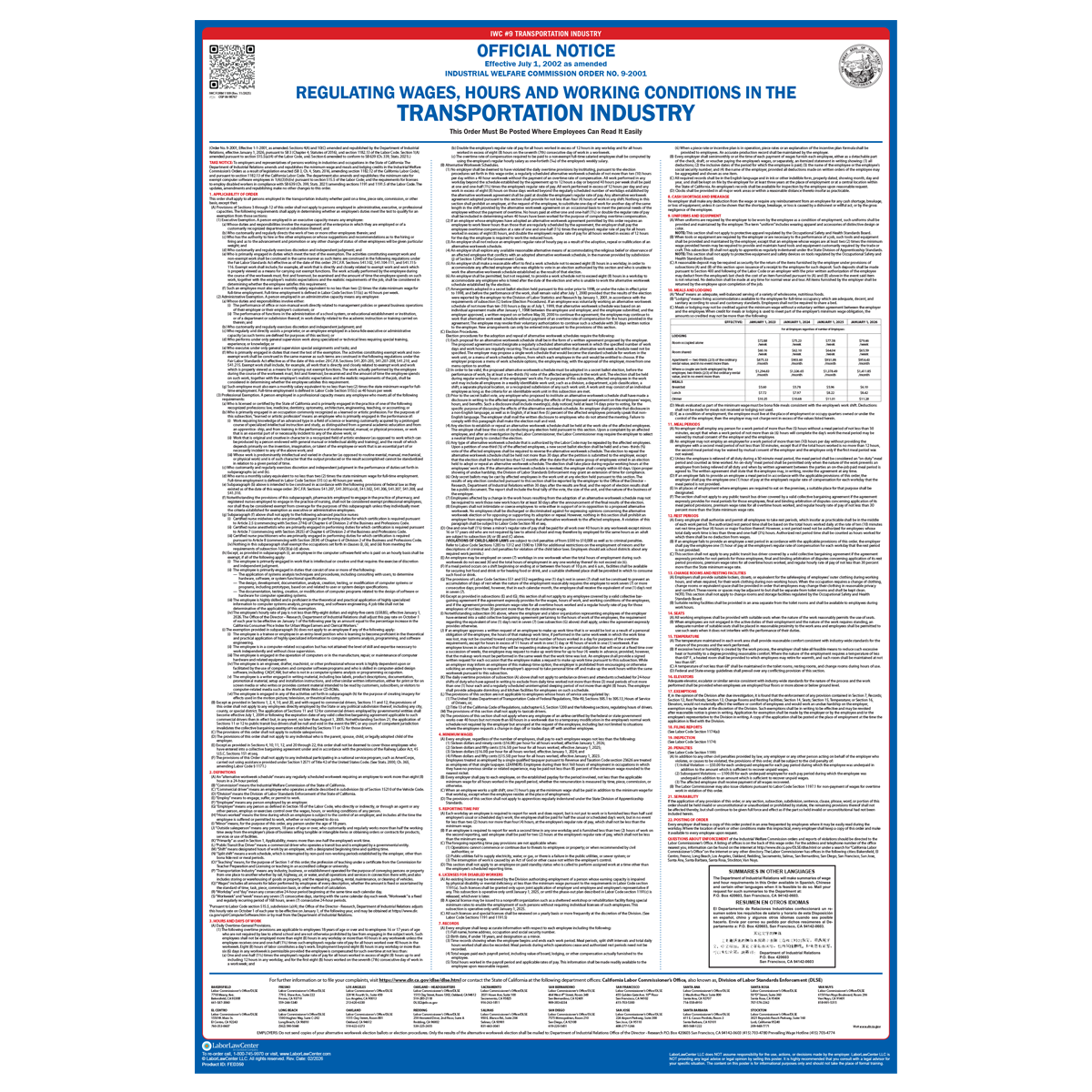 The Industrial Welfare Commission is a California State Agency whose primary purpose is to ascertain the wages paid to all employees in the state of California, to ascertain the hours and conditions of labor and employment in the various occupations, trades and industries in which employees are employed in this state, and to investigate the health, safety and welfare of those employees. The Industrial Welfare Commission has mandated that specific wage orders be posted, in the workplace, to inform employees of their wage and hour rights. These wage orders are known as IWC Postings or IWC Wage Orders. It is broken into 17 different categories. The poster is a mandatory poster that must be posted next to the State and Federal labor laws.
