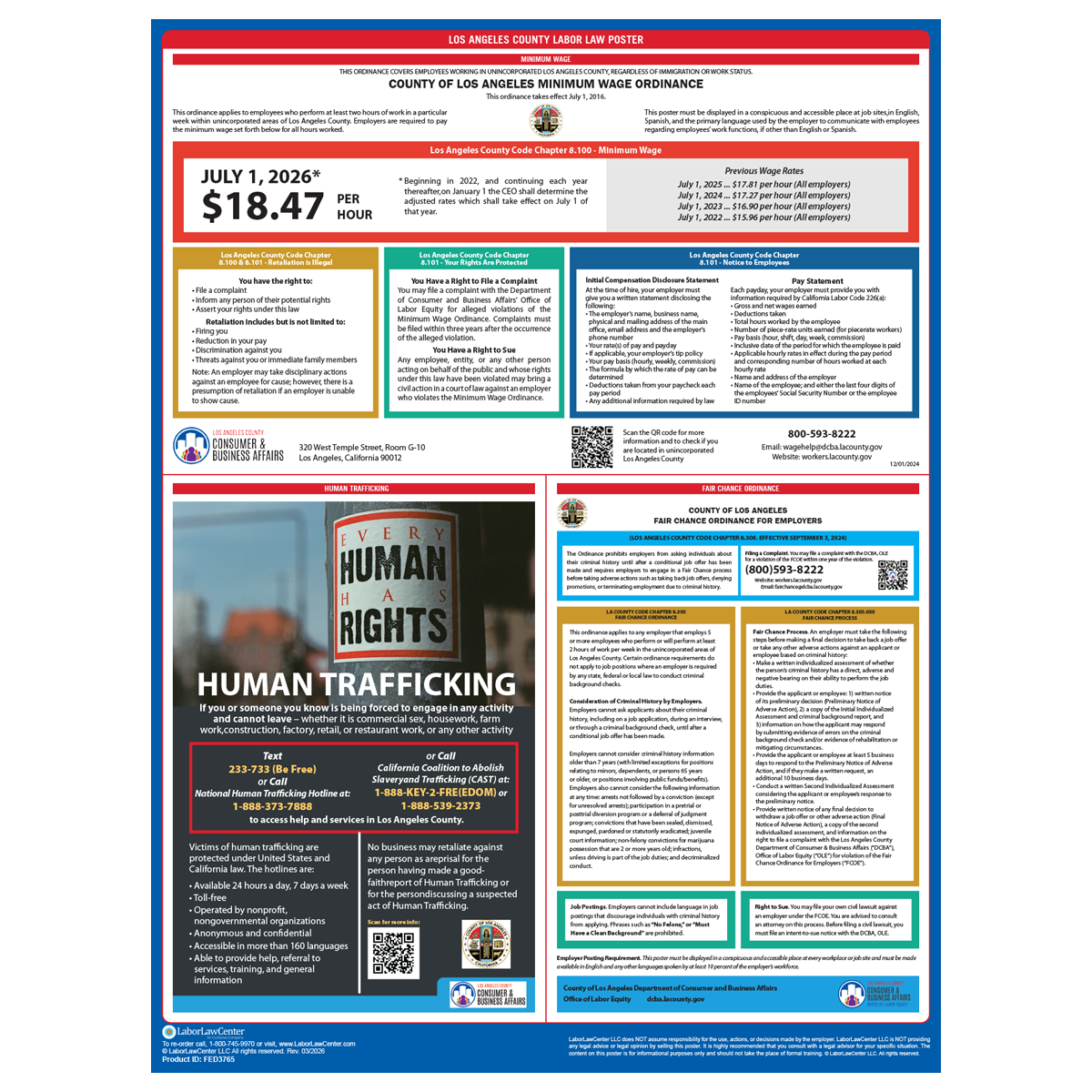 • This laminated Los Angeles County poster has recent labor law postings that meet business requirements to protect employers from posting fines and employee disputes. Please post this poster in addition to your existing California state & federal labor law posters.