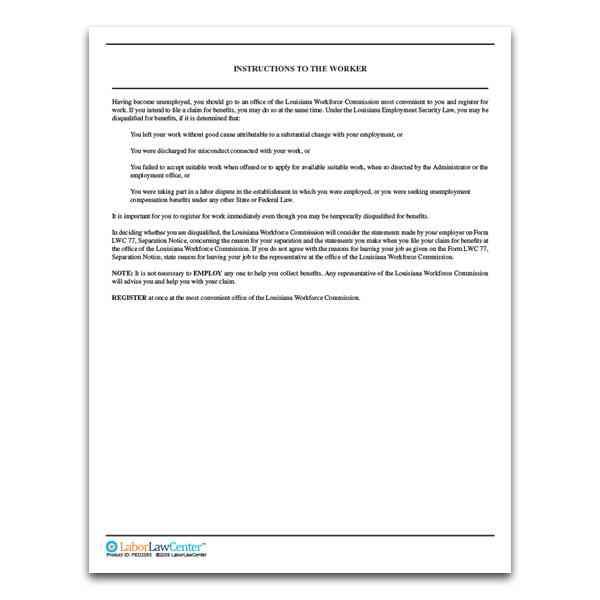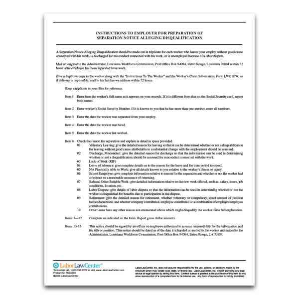 The Louisiana Workforce Commission requires that employers complete a Separation Notice Alleging Disqualification for each worker who leaves employment without good cause connected with his work, is discharged for misconduct connected with his work, or is unemployed because of a labor dispute.