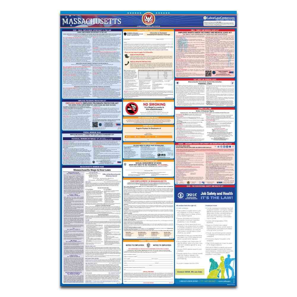Place one order for the Massachusetts Compliance Protection Plan and all of the state and federal workplace postings legally required will be yours through the Massachusetts State and Federal Complete Labor Law Poster which is included in the Protection Plan. This is an all-in-one poster that satisfies all of your employment workplace posting requirements. In addition, it’s important to note that if you fail to display the current labor law posters at your firm, you may face disputes and lawsuits from your employees due to non-compliance in this area.