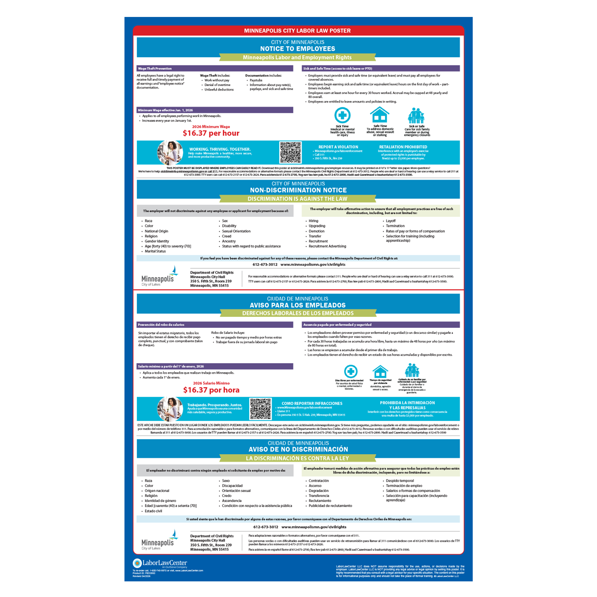 All businesses with employees in Minneapolis, MN are legally required to post this city mandated poster in addition to Minnesota State & Federal Labor Law Posters. This poster meets requirements & protects businesses from posting fines & employee disputes.