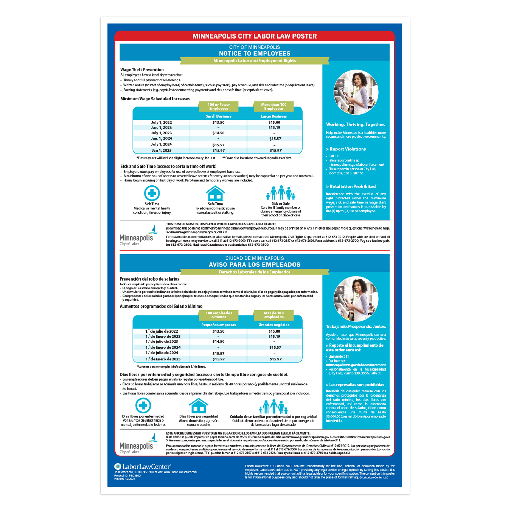 All businesses with employees in Minneapolis, MN are legally required to post this city mandated poster in addition to Minnesota State & Federal Labor Law Posters. This poster meets requirements & protects businesses from posting fines & employee disputes.