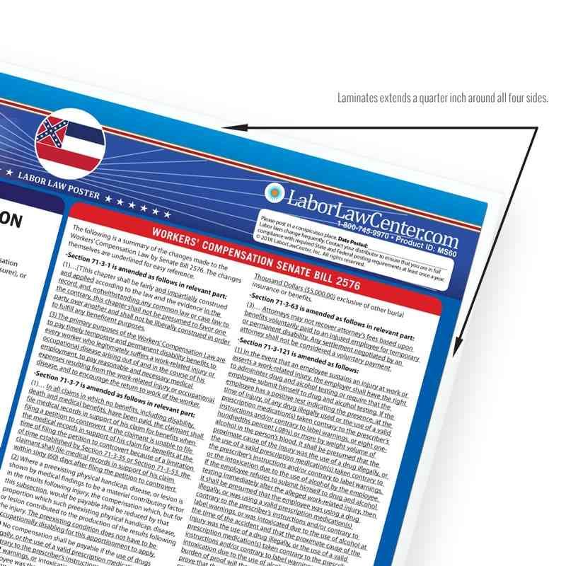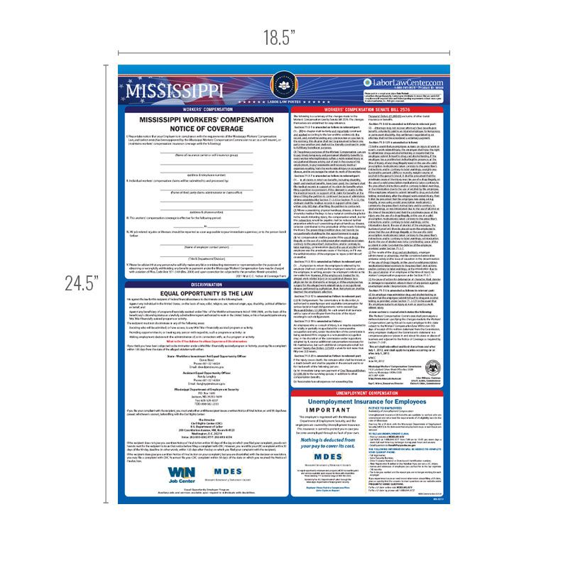 Looking for a single poster that includes all mandatory regulations? Consider our Mississippi Complete Labor Law Poster. This oversized poster includes all state, federal, and OSHA requirements on single poster for $29.95. This poster is typically attractive to businesses that just want everything on one poster, rather than purchasing multiple posters to meet compliance requirements.