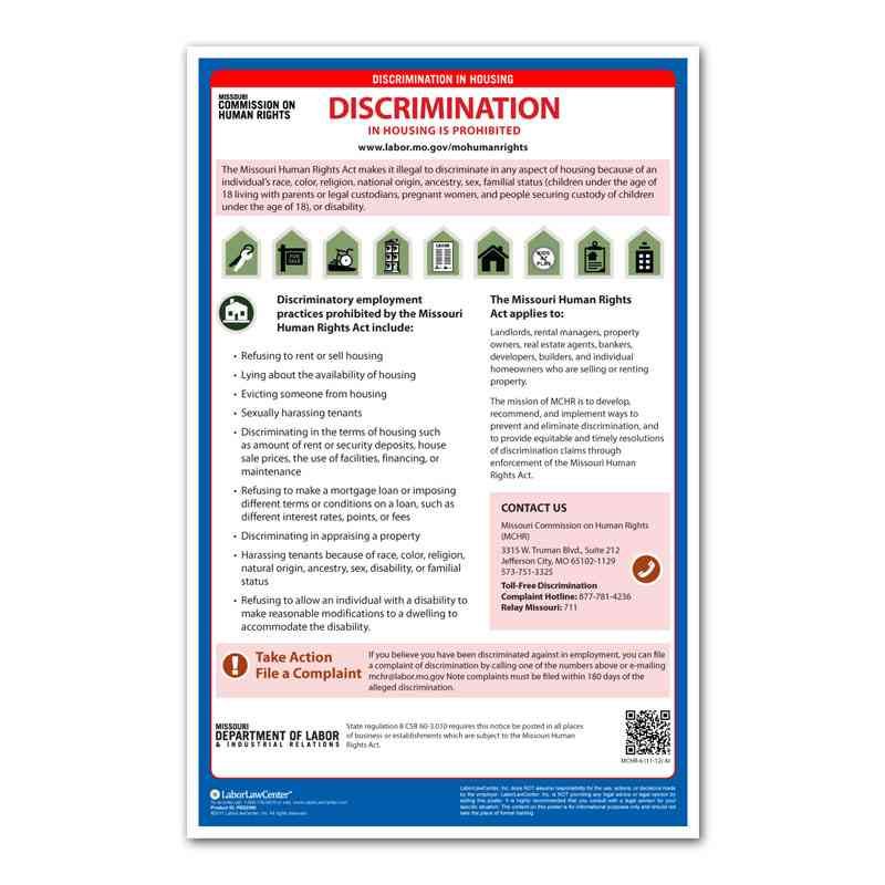 The State of Missouri requires employers in the business of sale or rental of housing to post the Missouri Discrimination in Housing Poster MCHR-6. The poster states that it is illegal to discriminate in any aspect of housing and employers who engage in real estate transactions in Missouri must post this poster to be in compliance. The poster is mandated to be in an 11” x 17” format.