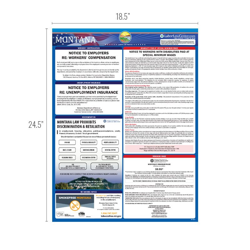 Looking for a single poster that includes all mandatory regulations? Consider our Montana Complete Labor Law Poster. This oversized poster includes all state, federal, and OSHA requirements on single poster for $29.95. This poster is typically attractive to businesses that just want everything on one poster, rather than purchasing multiple posters to meet compliance requirements.