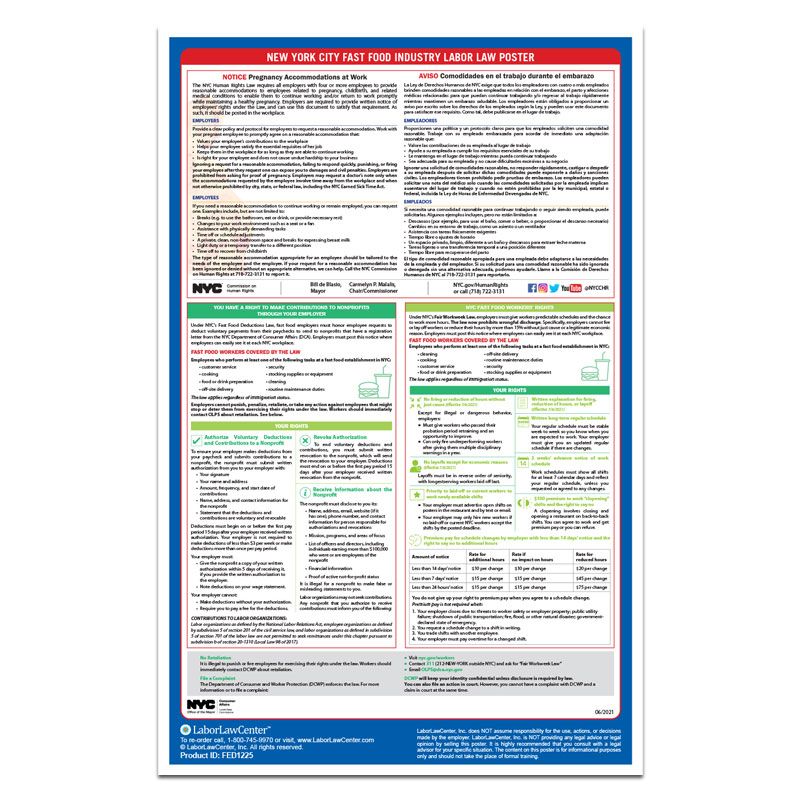 Fast food workers in NYC are provided specific protections under labor laws enforced by the NYC Department of Consumer and Worker Protection. Workers must be notified of their rights set forth in the NYC Fast Food Industry Labor Law Poster.