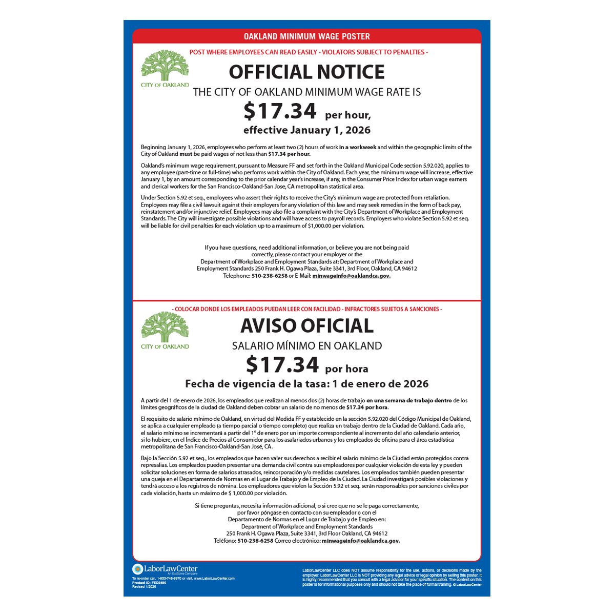 All businesses with employees in Oakland, CA are legally required to post this city mandated poster in addition to California State & Federal Labor Law Posters. This poster meets requirements & protects businesses from posting fines & employee disputes.