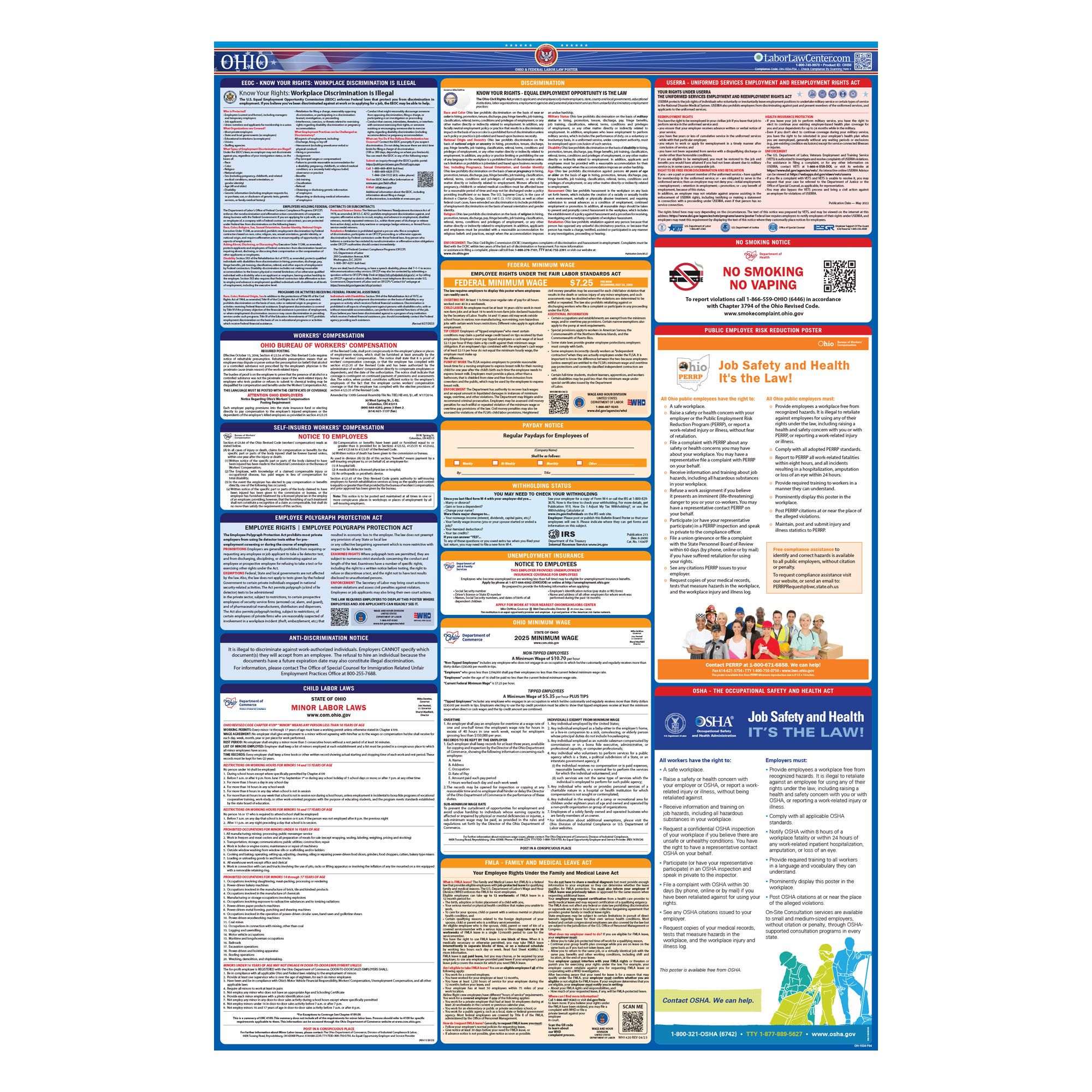 Ensuring proper and up to date posting of the labor law posters can be a time consuming task. Our Ohio State and Federal Complete Labor Law Poster consolidates all of the applicable labor laws into one attractive poster. Ohio State requires an Ohio minimum wage poster that properly informs employees of their minimum wage rate and right. The Ohio Complete Labor Law Poster includes the Ohio minimum wage poster along with the mandatory Federal minimum wage posting. Obtaining the required labor law posters may seem complicated but it can be simplified with the Complete Ohio Labor Law Poster.