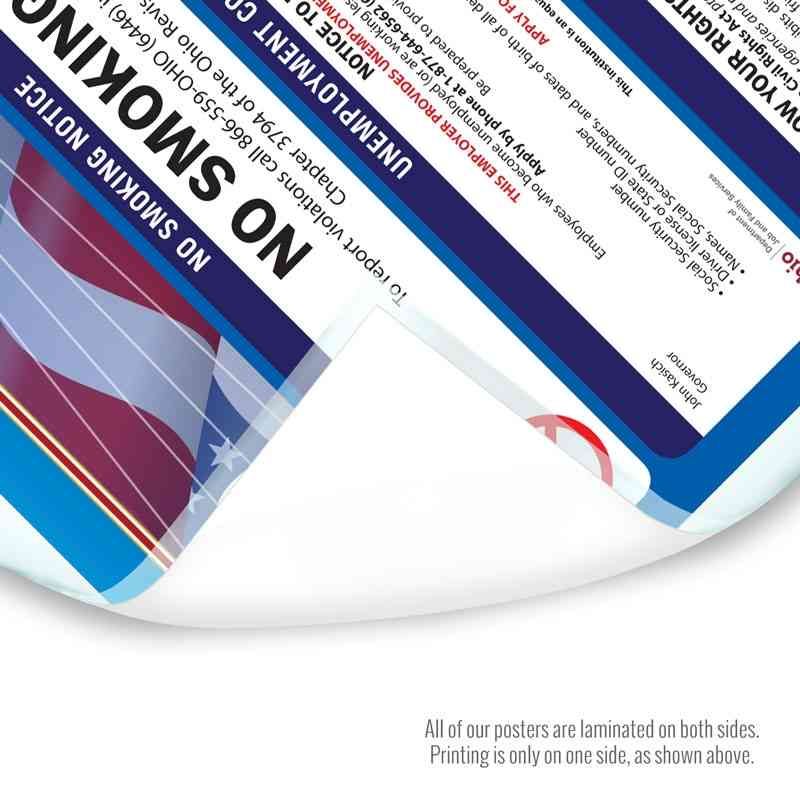 The Ohio and US government mandate that both state and federal posters be posted. For your convenience and preference, we currently offer both formats to assist you with your compliance needs. Posters are typically purchased separately (state and federal) due to a business’ preference, or if size doesn't permit, a single Complete poster that may be larger. We are the industry’s leading company that can provide you with either option including: the Ohio State Only Labor Law Poster, which includes all mandatory state requirements on a single poster for $21.95, and the mandatory Federal Poster for $12.95, which you can add to your order in the purchasing options above. We conveniently offer both formats for your organization.