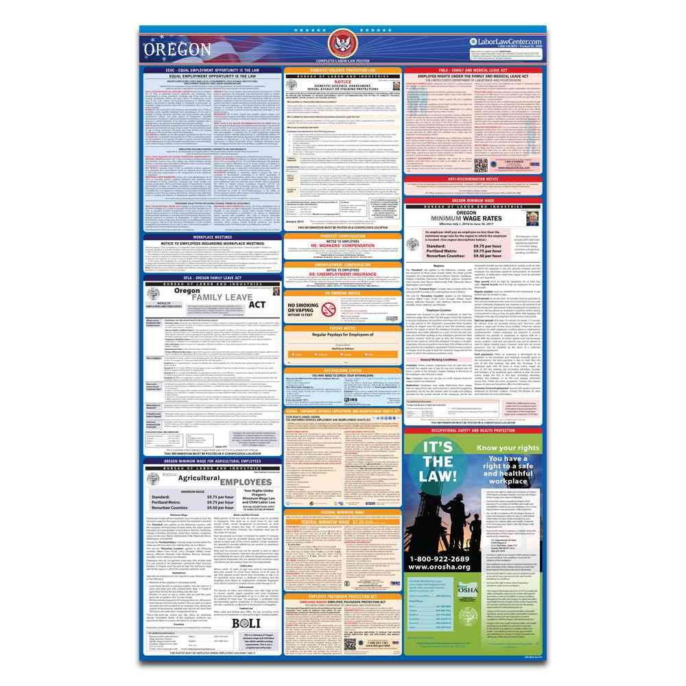 Place one order for the Oregon & Federal Labor Law Poster + 2024 Replacement Service and all of the state and federal workplace postings legally required will be yours through the Oregon State and Federal Complete Labor Law Poster. This is a complete poster that satisfies all of your employment workplace posting requirements. In addition, it’s important to note that if you fail to display the current labor law posters at your firm, you may face disputes and lawsuits from your employees due to non-compliance in this area.