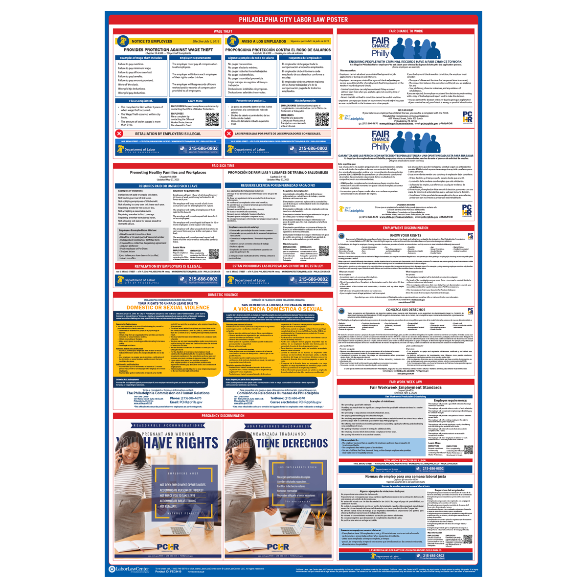 All businesses with employees in Philadelphia, PA are legally required to post this city mandated poster in addition to Pennsylvania State & Federal Labor Law Posters. This 24 x 36 poster meets requirements & protects businesses from posting fines & employee disputes.