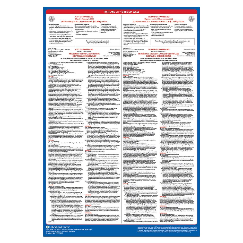 All businesses with employees in Portland, ME are legally required to post this city mandated poster in addition to Maine State & Federal Labor Law Posters. This poster meets requirements & protects businesses from posting fines & employee disputes.