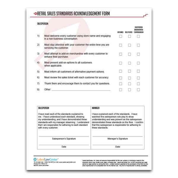Our full-color Retail Sales Standard Acknowledgement Form is the ideal, convenient and practical tool you need to evaluate sales staff performance. The form also has a section for the salesperson and manager to sign and indicate areas that are in need of improvement. Each form is 8.5 x 11, making it easy to store and scan, and each package comes with 25 ready-to-use forms.