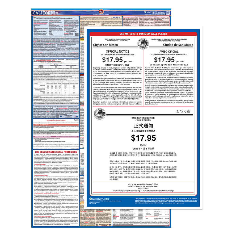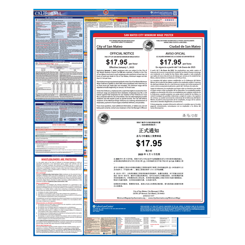 All businesses with employees in San Mateo, CA are legally required to post this city mandated poster in addition to California State & Federal Labor Law Posters. This poster meets requirements & protects businesses from posting fines & employee disputes.