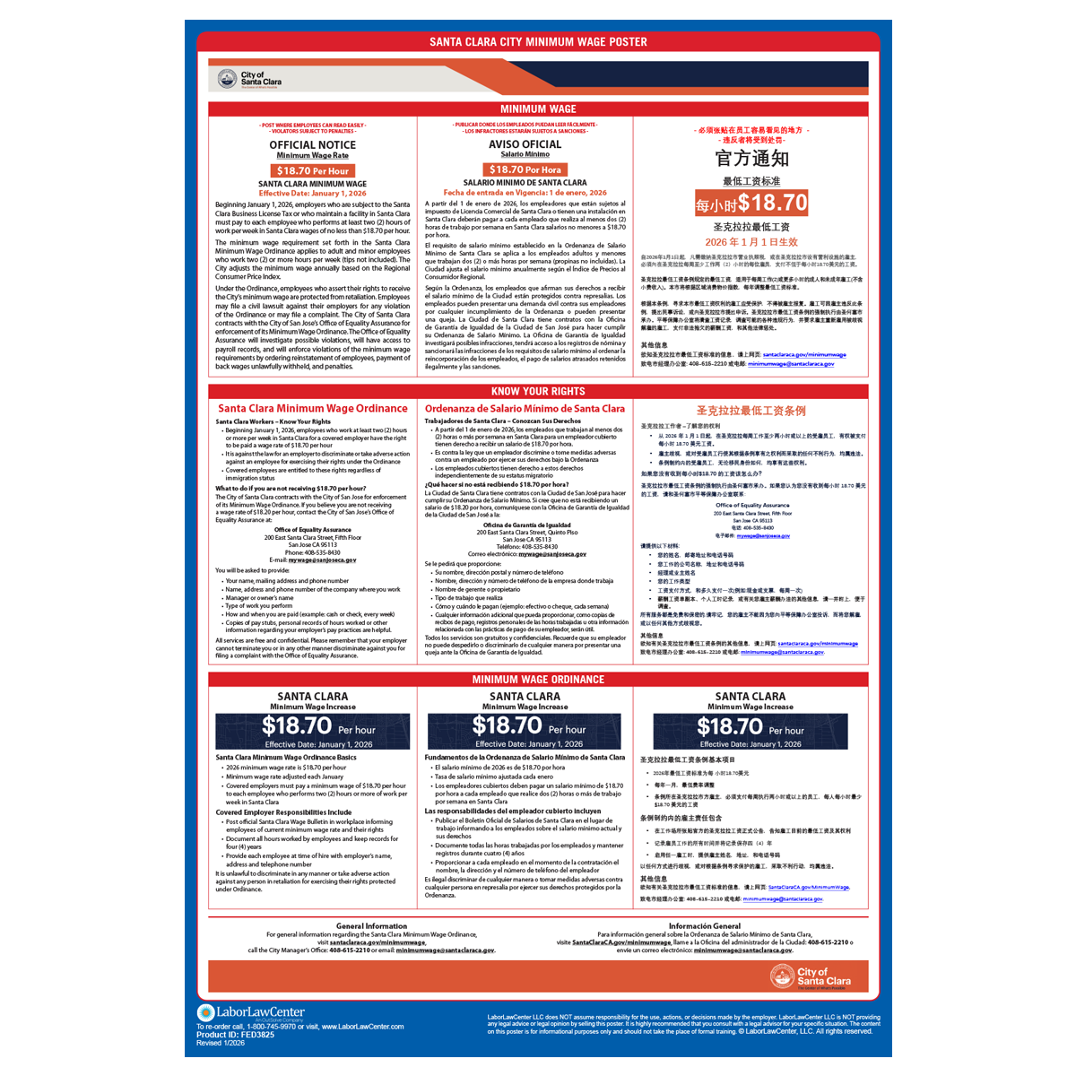 All businesses with employees in Santa Clara, CA are legally required to post this city mandated poster in addition to California State & Federal Labor Law Posters. This poster meets requirements & protects businesses from posting fines & employee disputes.