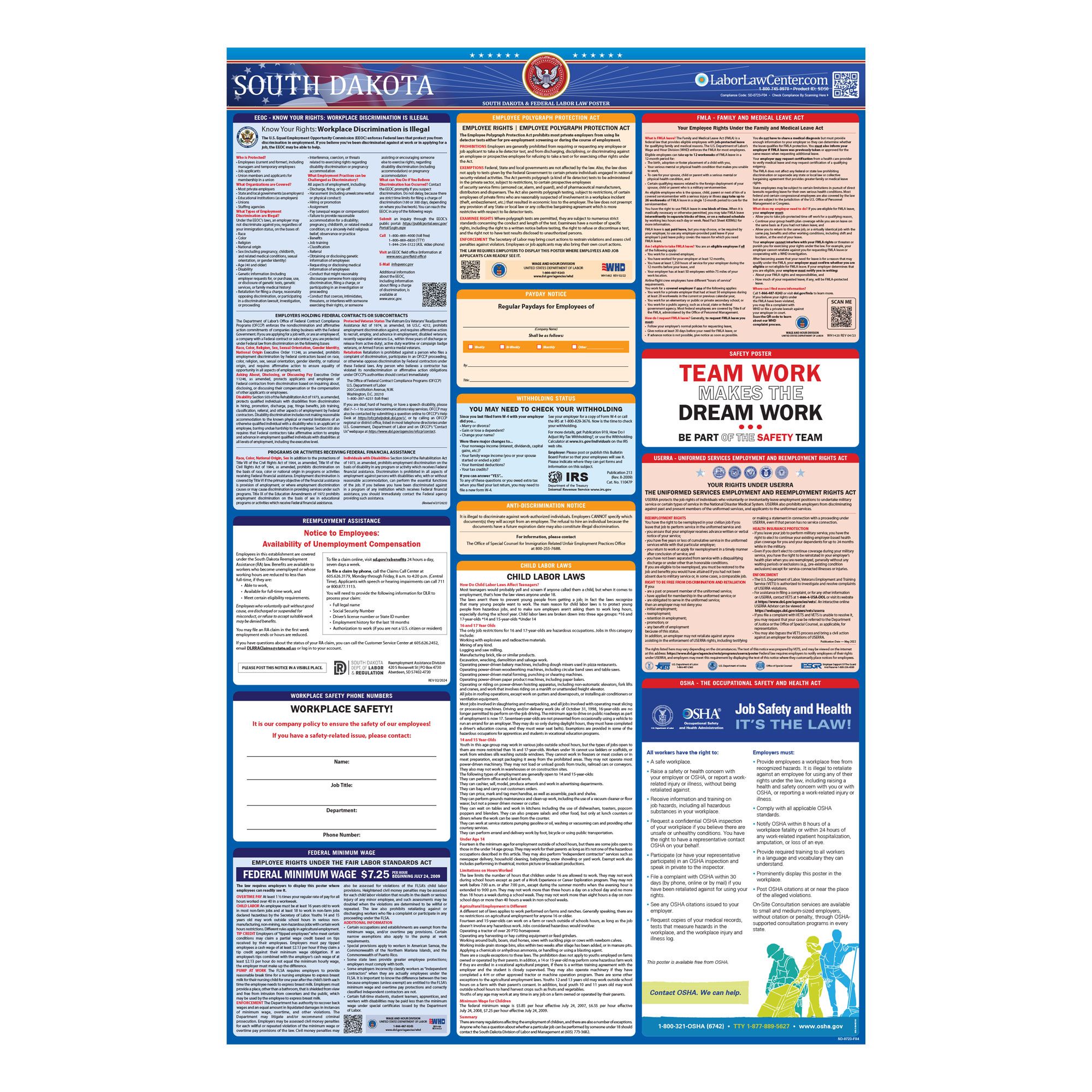 The easy solution to this issue is the purchase of the South Dakota State and Federal Complete Poster by LaborLawCenter™, the all-in-one state and federal labor law poster. This poster makes it easy to satisfy your employment workplace posting requirements by just placing it in a conspicuous location for all employees to see. Simple and easy!