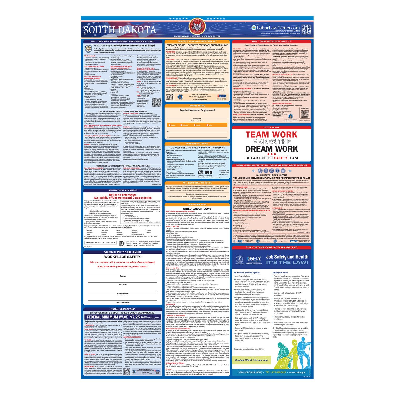 <td>The OSHA poster is included on the South Dakota Complete Labor Law Poster. When you order the South Dakota Complete Labor Law Poster, it will satisfy your State, Federal, and OSHA posting requirements with one poster.</td>