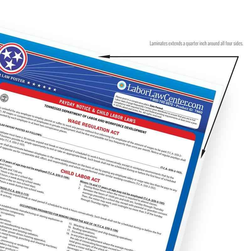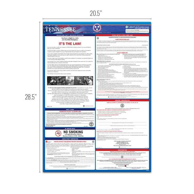 Looking for a single poster that includes all mandatory regulations? Consider our Tennessee Complete Labor Law Poster. This oversized poster includes all state, federal, and OSHA requirements on single poster for $29.95. This poster is typically attractive to businesses that just want everything on one poster, rather than purchasing multiple posters to meet compliance requirements.
