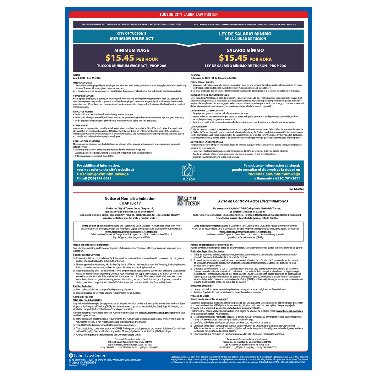 All businesses with employees in Tucson, AZ are legally required to post this city-mandated minimum wage labor law poster in addition to Arizona State & Federal Labor Law Posters.