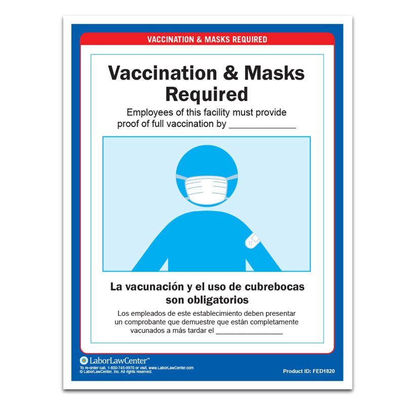 This sign is intended for businesses which require employees and/or customers/clients/patients to be vaccinated and also wear masks on the business' premises. The sign should be displayed in break rooms or other prominent locations for employees to see and on doors or windows if the requirement applies.