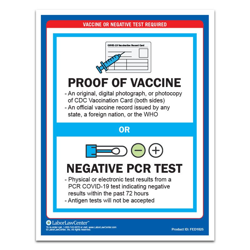 This sign is intended for businesses which require employees and/or customers/clients/patients to show proof of vaccination or to show proof of negative Covid-19 test before entering the business' premises. The sign should be displayed in break rooms or other prominent locations for employees to see and on doors or windows if the requirement applies.