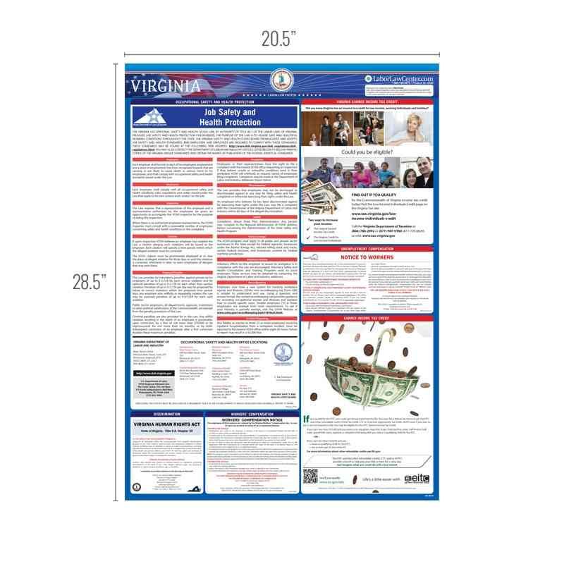 Looking for a single poster that includes all mandatory regulations? Consider our Virginia Complete Labor Law Poster. This oversized poster includes all state, federal, and OSHA requirements on single poster for $29.95. This poster is typically attractive to businesses that just want everything on one poster, rather than purchasing multiple posters to meet compliance requirements.