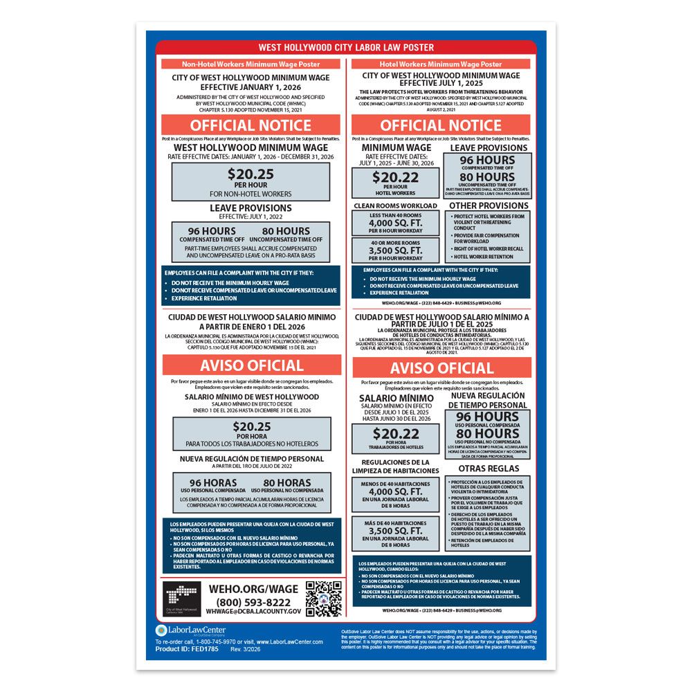 All businesses with employees in West Hollywood, CA are legally required to post this city-mandated minimum wage labor law poster in addition to California State & Federal Labor Law Posters.