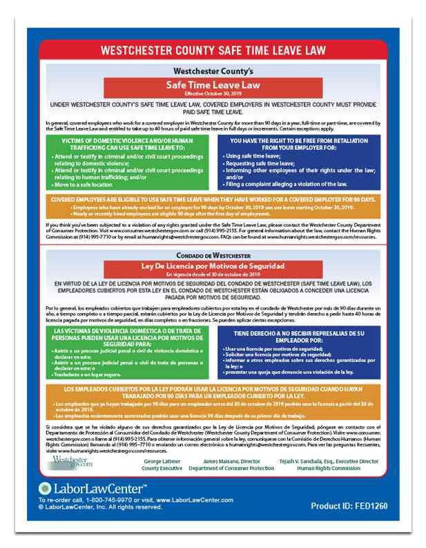 All businesses with employees in the Westchester County must hang this poster, in addition to New York State & Federal Labor Law Posters. This poster includes the Westchester County Safe Time Leave Law notice.