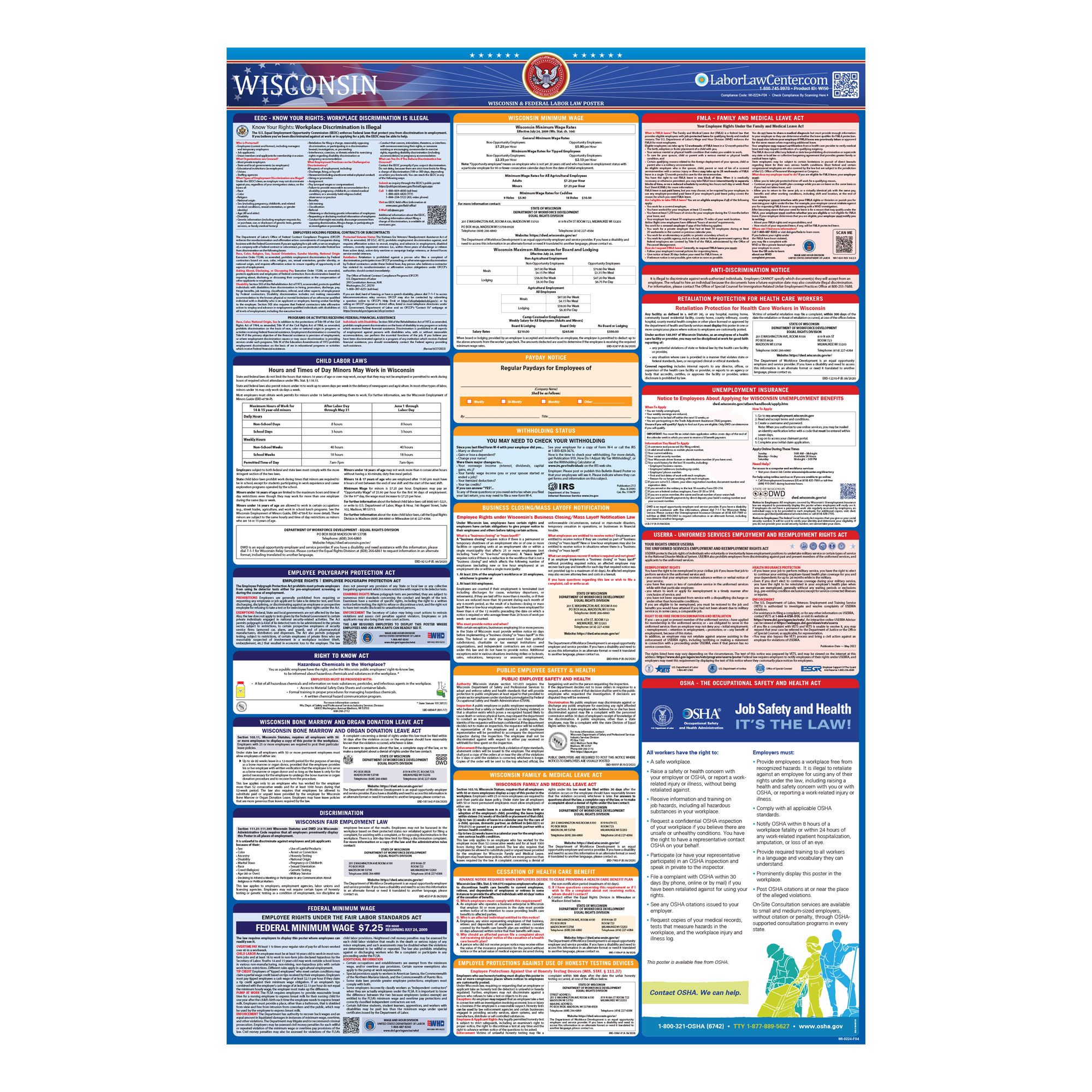 Labor law poster requirements must be followed precisely in order to avoid legal consequences and/or citations set forth by the US Department of Labor (DOL).  Posting the appropriate state and federal workplace postings including EEO, OSHA, and FMLA, in a conspicuous location for employees to see, is necessary to comply with the law. With the Wisconsin State and Federal Complete Poster you will be taking this necessary step to ensure you are in legal compliance with the Department of Labor's (DOL) requirements.