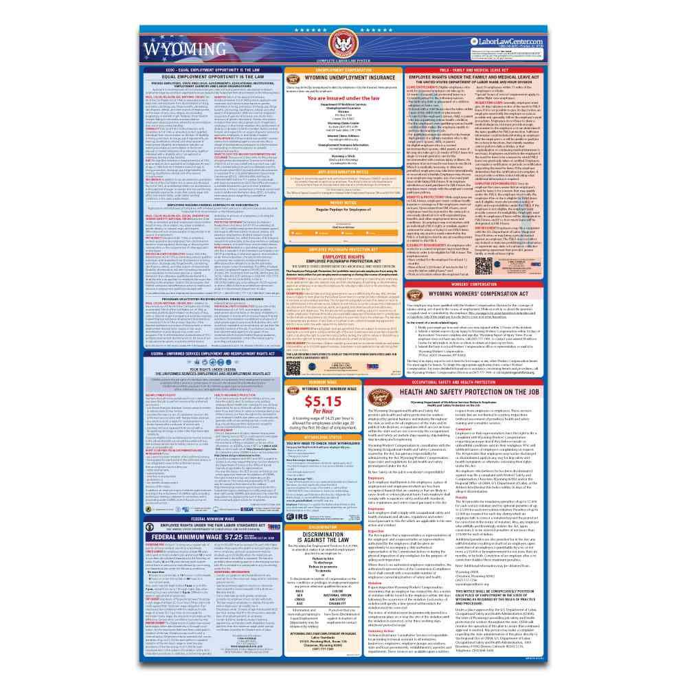 Place one order for the Wyoming & Federal Labor Law Poster + 2024 Replacement Service and all of the state and federal workplace postings legally required will be yours through the Wyoming State and Federal Complete Labor Law Poster. This is a complete poster that satisfies all of your employment workplace posting requirements. In addition, it’s important to note that if you fail to display the current labor law posters at your firm, you may face disputes and lawsuits from your employees due to non-compliance in this area.