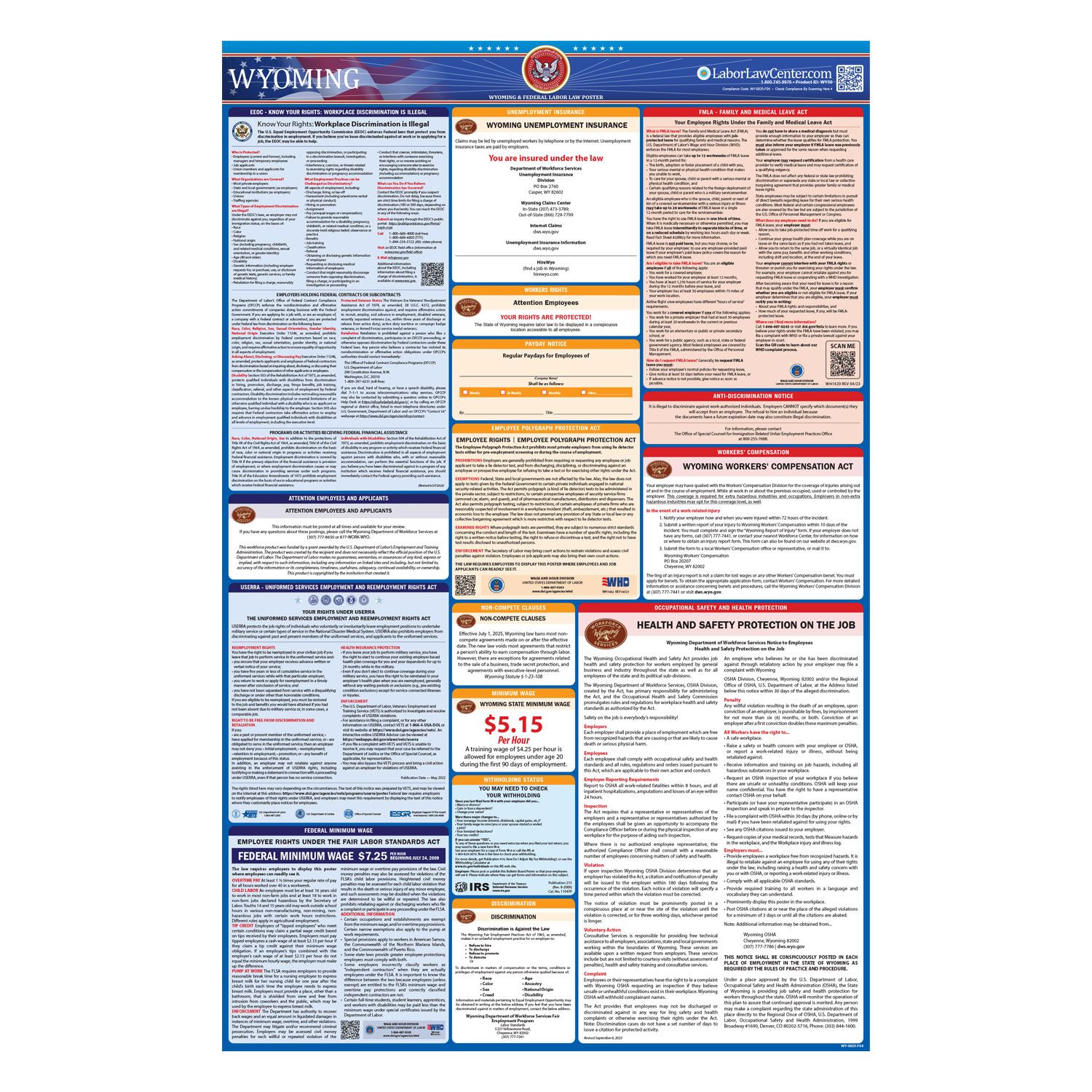 <p>Federal contractors and subcontractors are required to display more postings in addition to the general State, Federal, and OSHA regulations. Please <a href="https://www.laborlawcenter.com/federal-contractor-poster/" style="font-weight: bold">click here</a> to see the federal contractor and subcontractor posting requirements. Ensure your full compliance by posting the Wyoming Complete Labor Law Posters with the federal contractor-required postings.</p>
